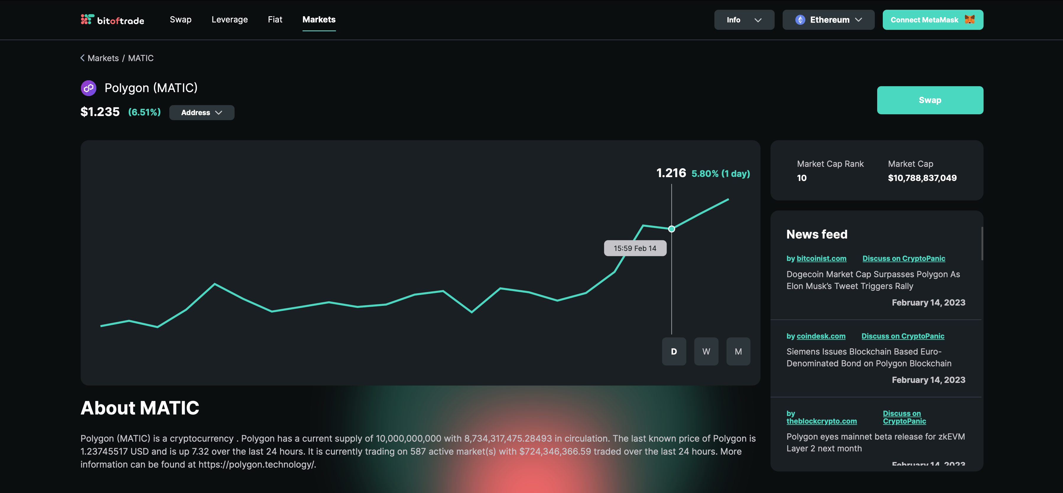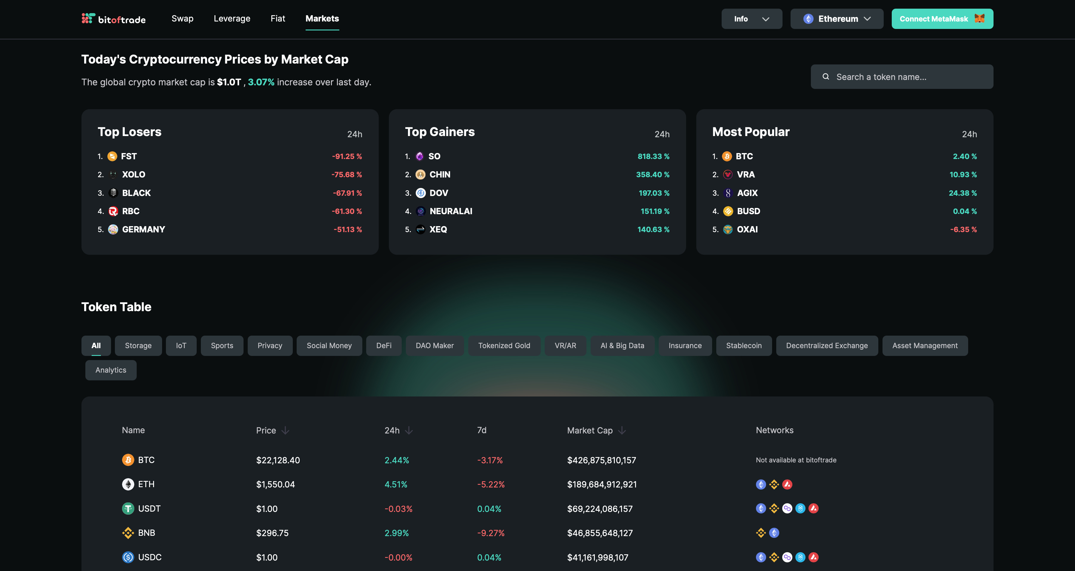 So, you can find out, for example, about the native tokens of decentralized exchanges — the price, total market cap and on which networks it is possible to trade on bitoftrade.